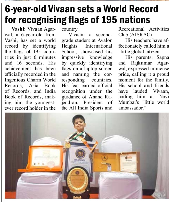 Vivaan Rajkumar Agrawal (born on 2nd September 2018) from Navi Mumbai, Maharashtra, has achieved a remarkable world record for the Fastest Time to Identify Flags of All 195 UN-Recognised Countries by a Child.