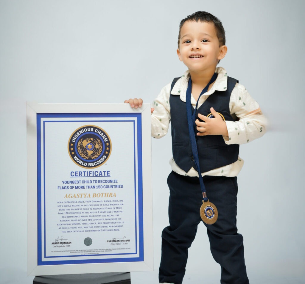 Agastya Bothra (born on 4th March 2023) from Guwahati, Assam, has created a remarkable world record in the Child Prodigy category by becoming the Youngest Child to Recognize Flags of More Than 150 Countries.